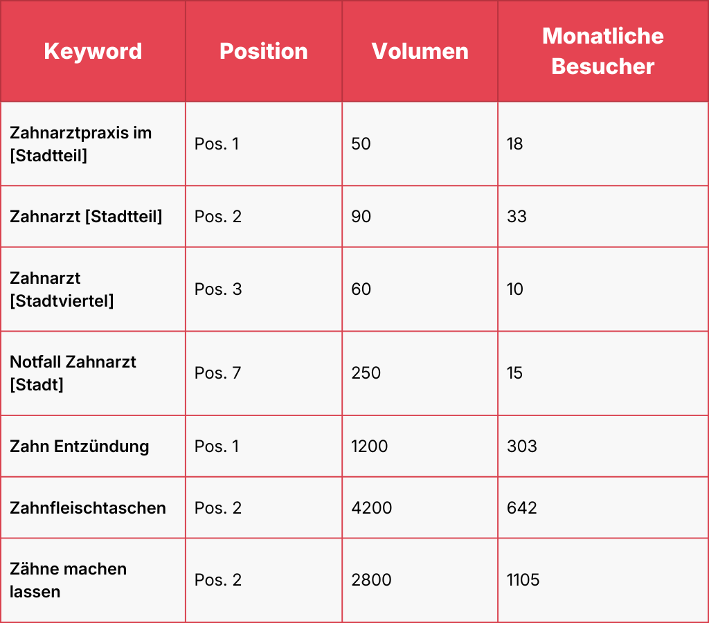 Die Konkurrenz unter Zahnärzten ist häufig groß. Unser Ziel war es, den Zahnarzt zu einer echten Marke zu machen und seine lokale Sichtbarkeit zu stärken. So können über Google und andere Suchmaschinen organisch Leads generiert werden.